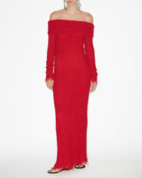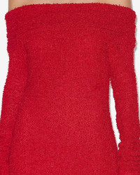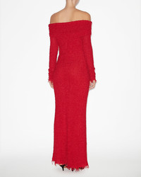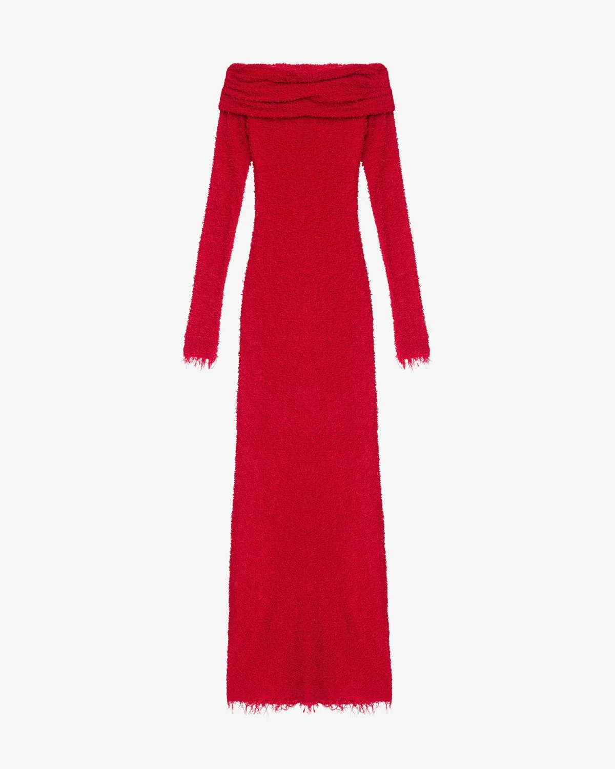 Textured boucle jersey dress Bardot neckline Long sleeves Done up on the side with a hidden zipper Fringed finishes Neckline with inner silicon strip Crepe lining Long and fitted Style: RO0724FAC1K01I70RD ORMANY 81% viscose, 19% polyester