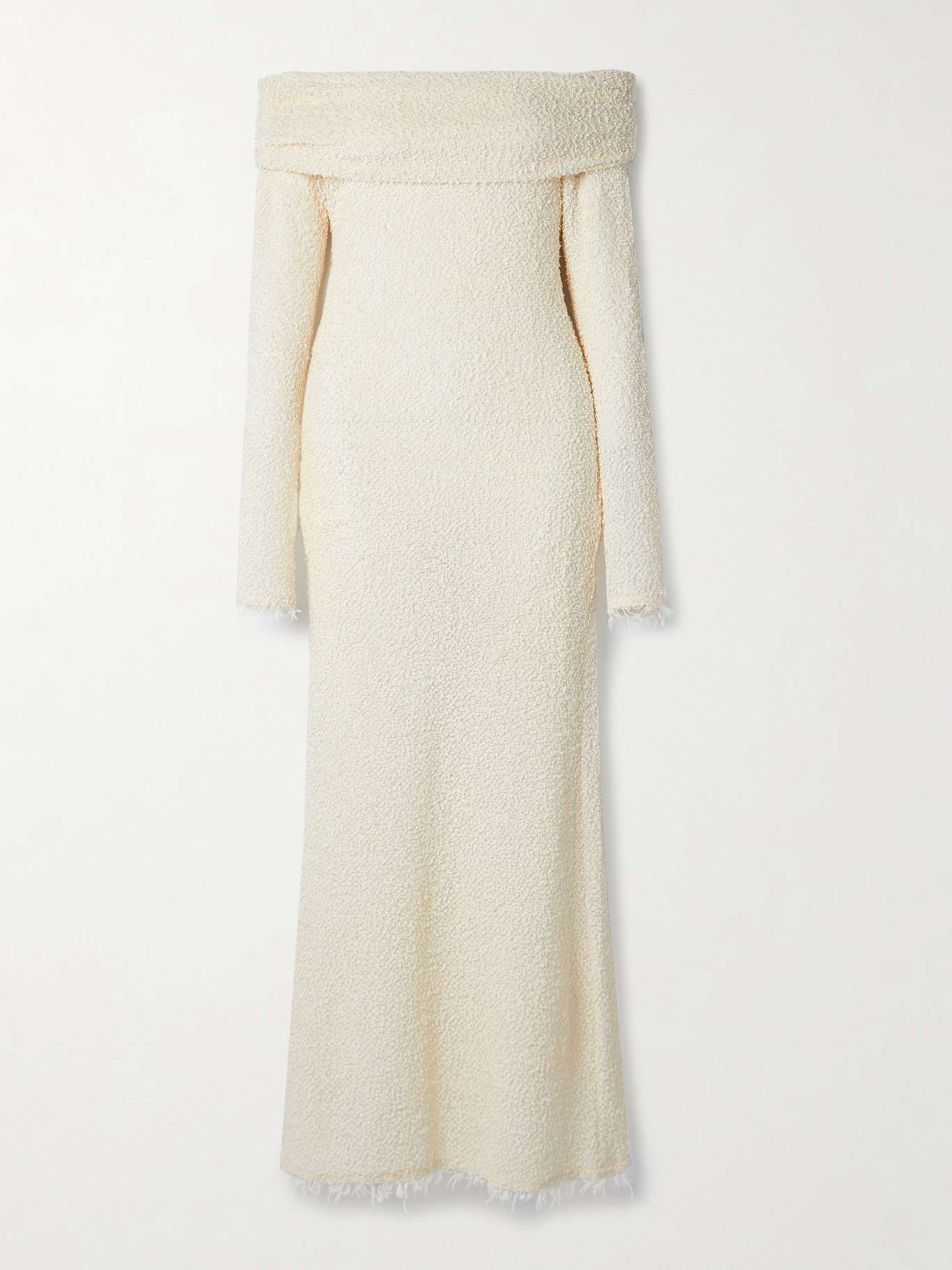 Ormany frayed off-the-shoulder bouclé maxi dress Ecru