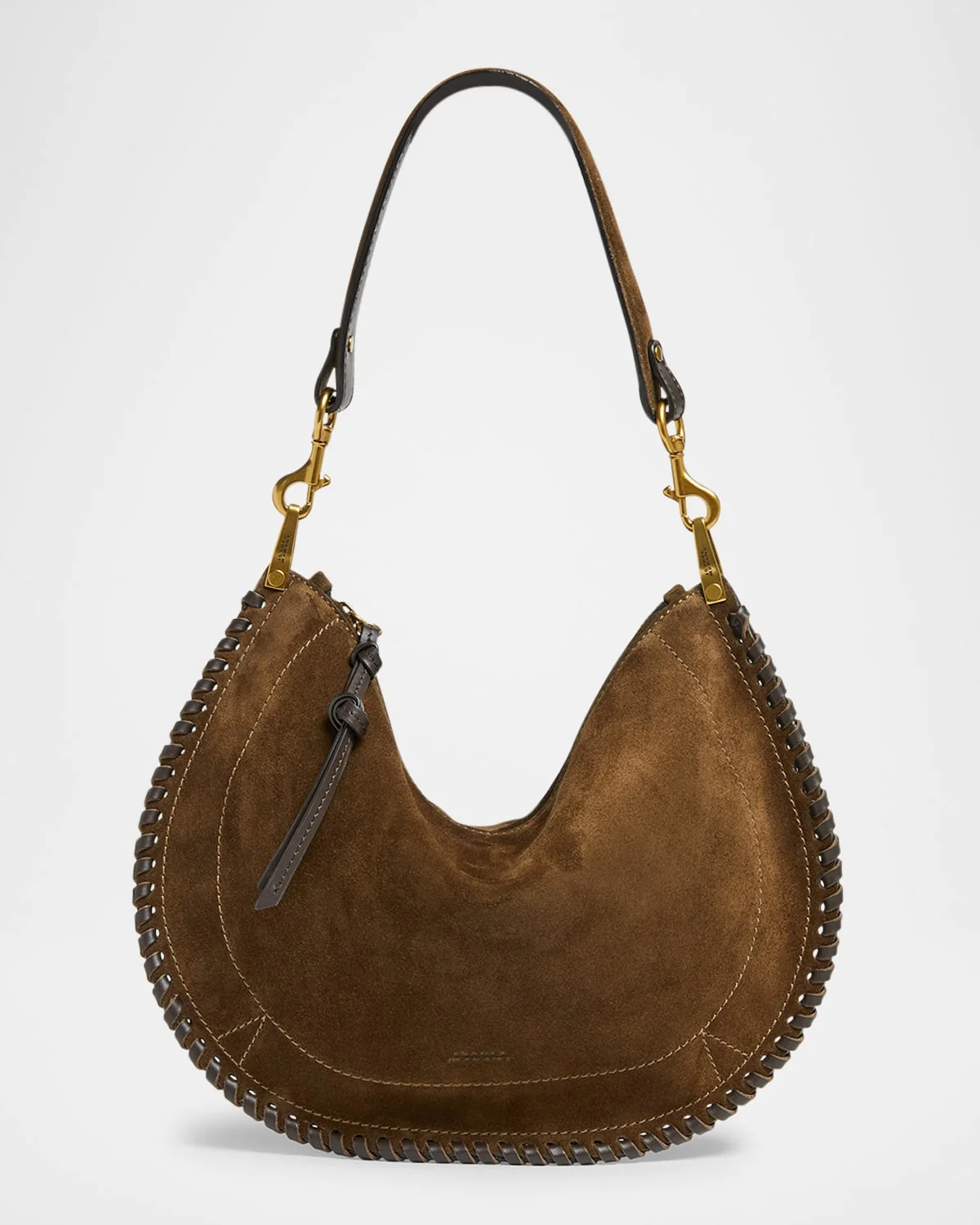 - Isabel Marant "Oskan" suede shoulder bag with braided leather trim - Detachable shoulder strap - Detachable, adjustable crossbody strap - Can be worn as a shoulder or crossbody bag - Zip top closure - Interior, one slip pocket - Lining: Cotton - Approx. 14.2"H x 16.5"W x 2.4"D - Item Weight (Lbs.): 1.5 - Imported
