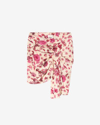 Short draped stretch silk rose print skirt Fitted waistband and hidden side zipper Wide tied tail in front Fitted cut and asymmetrical length Style: JU0422FCD1J11I40PK OVIA 91% silk, 9% elastane Care & Sustainability Dry clean only For more details, see the instructions on the composition label the history and environmental impact of this product