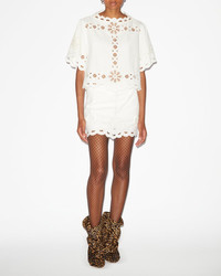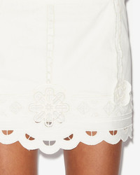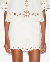Short skirt in plain-colored cotton with English embroidery Fitted waistband Openwork details and appliqued flowers Elaborate finishes Done up in back with a hook and a hidden zipper Cotton lining Straight cut Style: JU0242FA-B3J06I PALMIRA 100% cotton