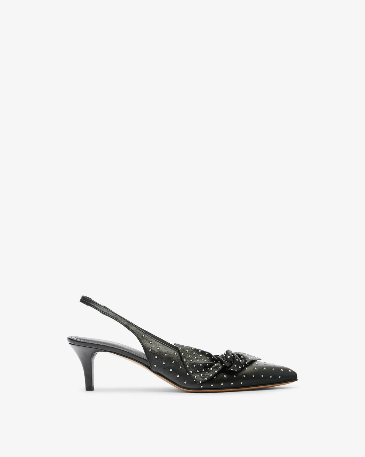 High-heeled studded lambskin leather pumps Pointed toes Elasticated ankle straps Side bows Soft leather insoles and outsoles Soft leather lining Heel height: 6 cm / 2.4 in. Style: ES0076FAD1A04SBKSI PALMO 100% lambskin leather Care & Sustainability the history and environmental impact of this product