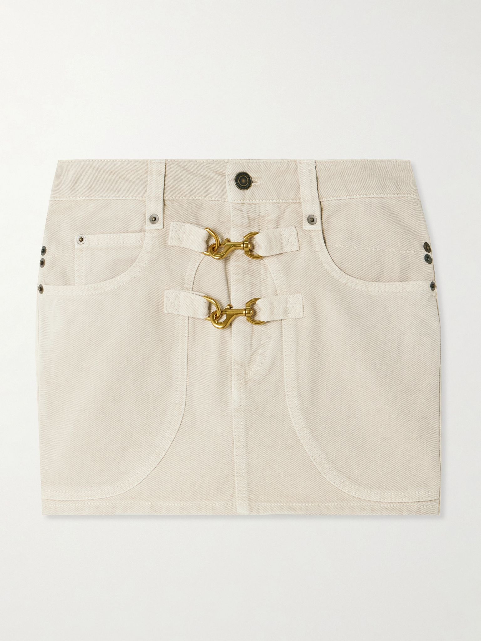 Isabel Marant's ‘Paulina’ mini skirt is embellished with gold-tone lobster clasp fastenings across the front, giving it a cool, utilitarian feel. It's made from ecru denim and has a classic five-pocket construction. Size & Fit - Fits true to size, take your normal size - Those with curvy hips may wish to take the next size up - Mini-length, designed to be worn just below the natural waist - Particularly short in length - Mid-weight, non-stretchy denim - Model is 175cm/ 5'9" and is wearing a FR 36 Model measurements: - Bust: 80cm/ 31.5" - Waist: 65cm/ 25.5" - Hip: 89cm/ 35" Details & Care - Ecru denim - Lobster clasp, button and concealed zip fastening at front - 80% cotton, 20% hemp; pocket lining: 100% cotton - Machine wash