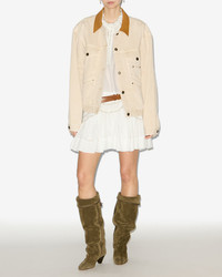Denim jacket with leather collar Contrasting leather shirt collar Long sleeves Straight buttoned cuffs Buttoned front Patch pockets with buttoned flaps on the chest Piped ticket pocket Piped side pockets Fitted waistband with buttoned tabs Leather label with an "Isabel Marant" logo Relaxed fit Style: VE0518FAC3H01I23EC PETUNIA 80% cotton, 20% hemp