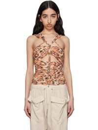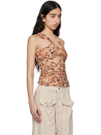 Silk gauze top. Ruching and printed graphic pattern throughout. · Plunging neck · Cutouts and braided detailing at front and back · Full silk gauze lining Supplier color: Orange Body: 100% silk. Lining: 100% silk. Made in India 251600F111001