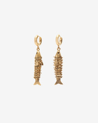 Pendant earrings with articulated fish Metal parts in gold-finish brass Hoops with built-in clasps 100% brass