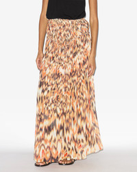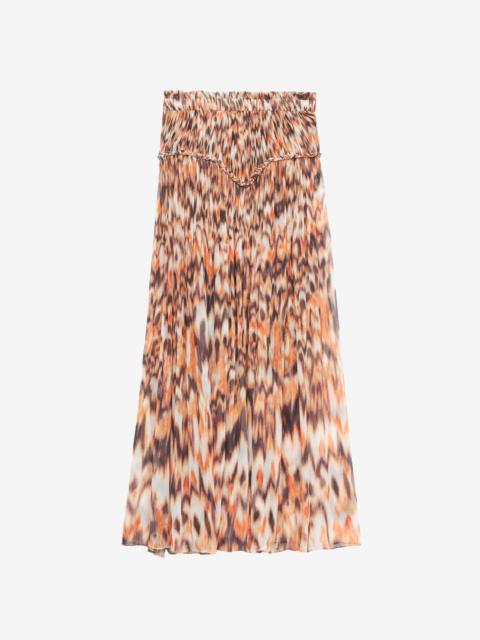 Long gathered silk skirt with butterfly print Elastic waist Braided silk details in front and back Done up on the side with a hook and a hidden zipper High waist Flared and flowing Style: JU0356FAC2J05I11OR ROLANDE 100% silk