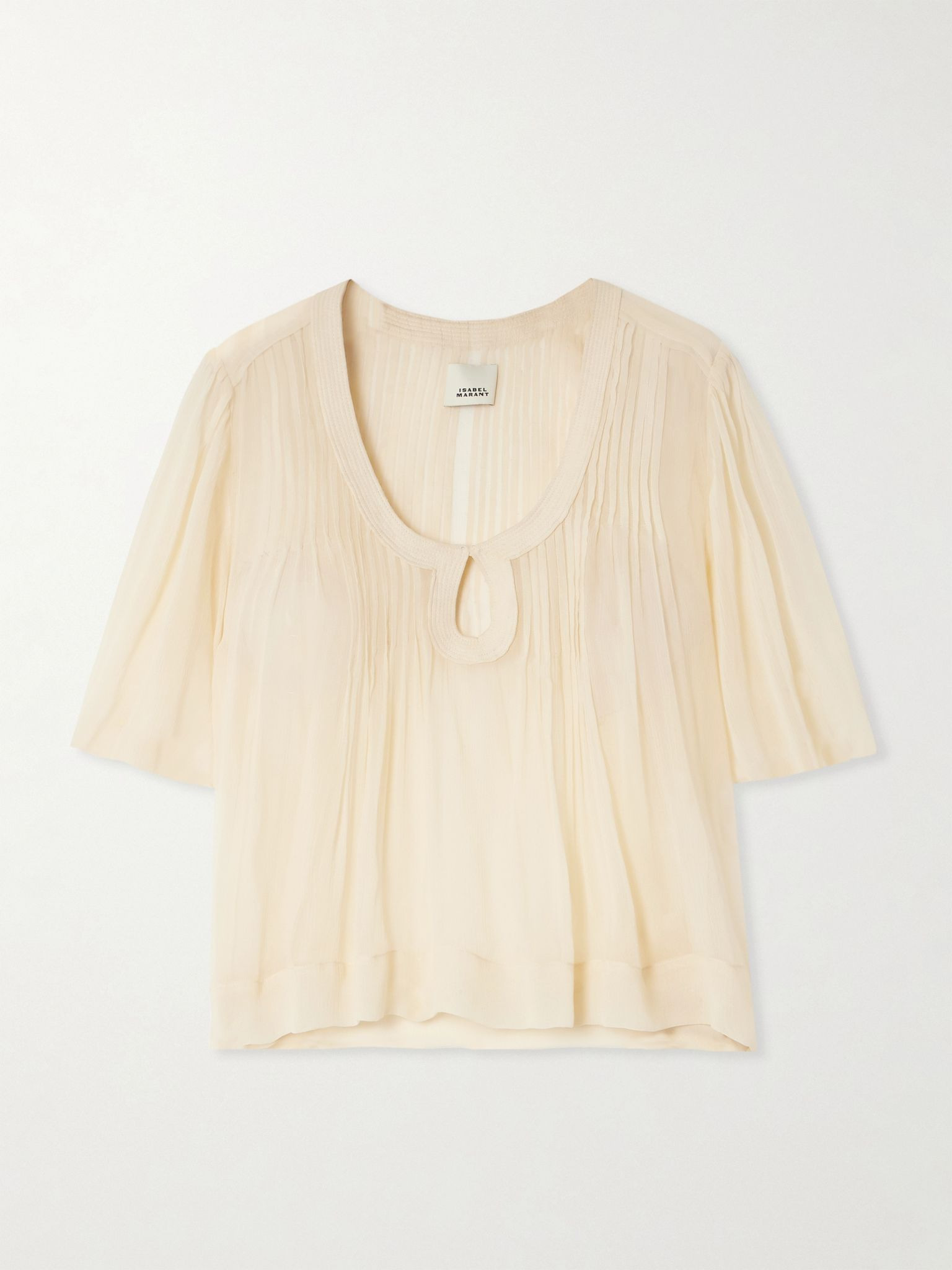Isabel Marant's collections have such a timelessness to them. This 'Ruta' top is cut from lightweight silk-crepon with a keyhole neckline and angel sleeves. Style yours with everything from denim to printed pants and mini shorts. Size & Fit - Fits true to size, take your normal size - Designed for a loose fit - Lightweight, semi-sheer, non-stretchy fabric - Model is 177cm/ 5'10" and is wearing a FR 36 Model measurements: - Bust: 81cm/ 32" - Waist: 66cm/ 26" - Hip: 94cm/ 37" Details & Care - Beige silk-crepon - Slips on - 100% silk; trim: 100% polyester - Dry clean