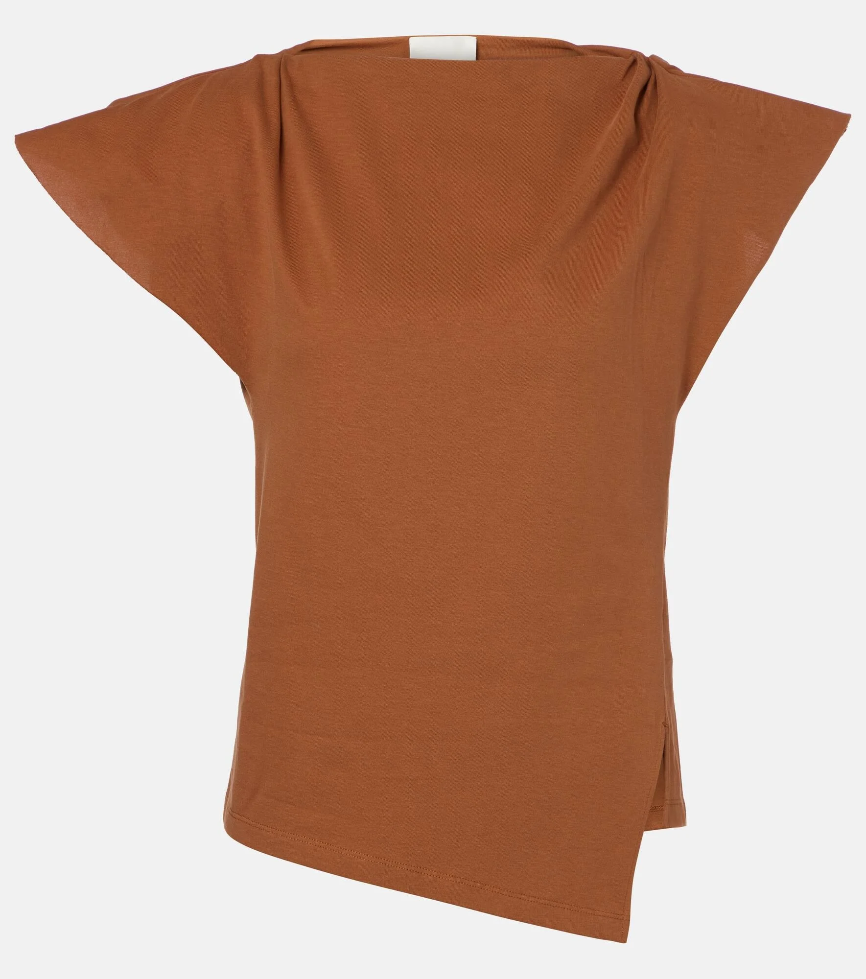 The Sebani T-shirt from Isabel Marant showcases an asymmetric style with padded shoulders and a side slit. Crafted from organic cotton, this design is cut to a relaxed silhouette. Product Details - Material: 100% cotton - Care instructions: machine wash at 30 degrees - Made in Portugal - Designer color name: Caramel - Item color: brown - Shoulder pads - Item number: P01074441 Size & Fit - True to size - Shoulder pad inserts - Straight fit - Slightly stretchy fabric - Falls to the hip - The model seen in the picture is 178cm-5'10" and wearing a size XS