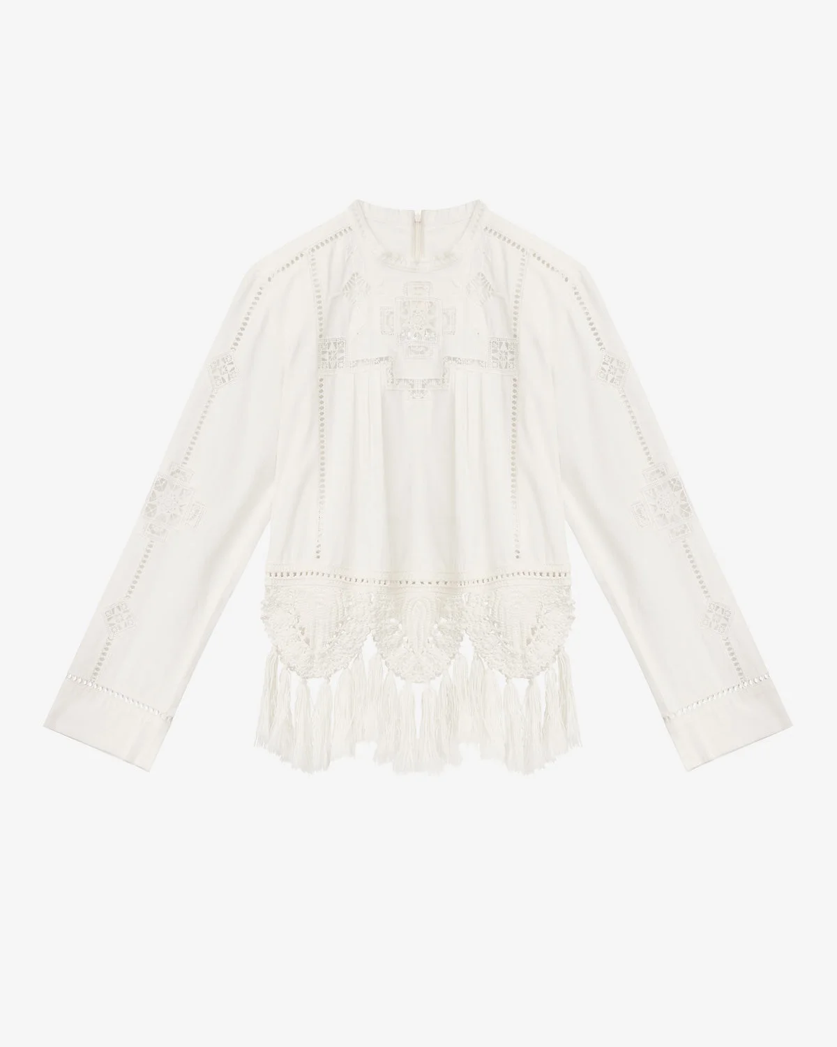 Cotton and macrame top Round neckline Long sleeves Pleated front English embroidery details Macrame finishes with fringes on the hem Done up in back with a hook and a hidden zipper Straight cut Style: HT0579FAC1J12I20WH SEVERINE 100% cotton