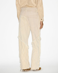 Jeans in topstitched patchwork denim Fitted waistband with loops Engraved metal button tab with a zipper Side pockets with ticket pockets Patch pockets on the back Topstitches and faded effects Fringed finishes Relaxed straight cut 80% cotton, 20% hemp