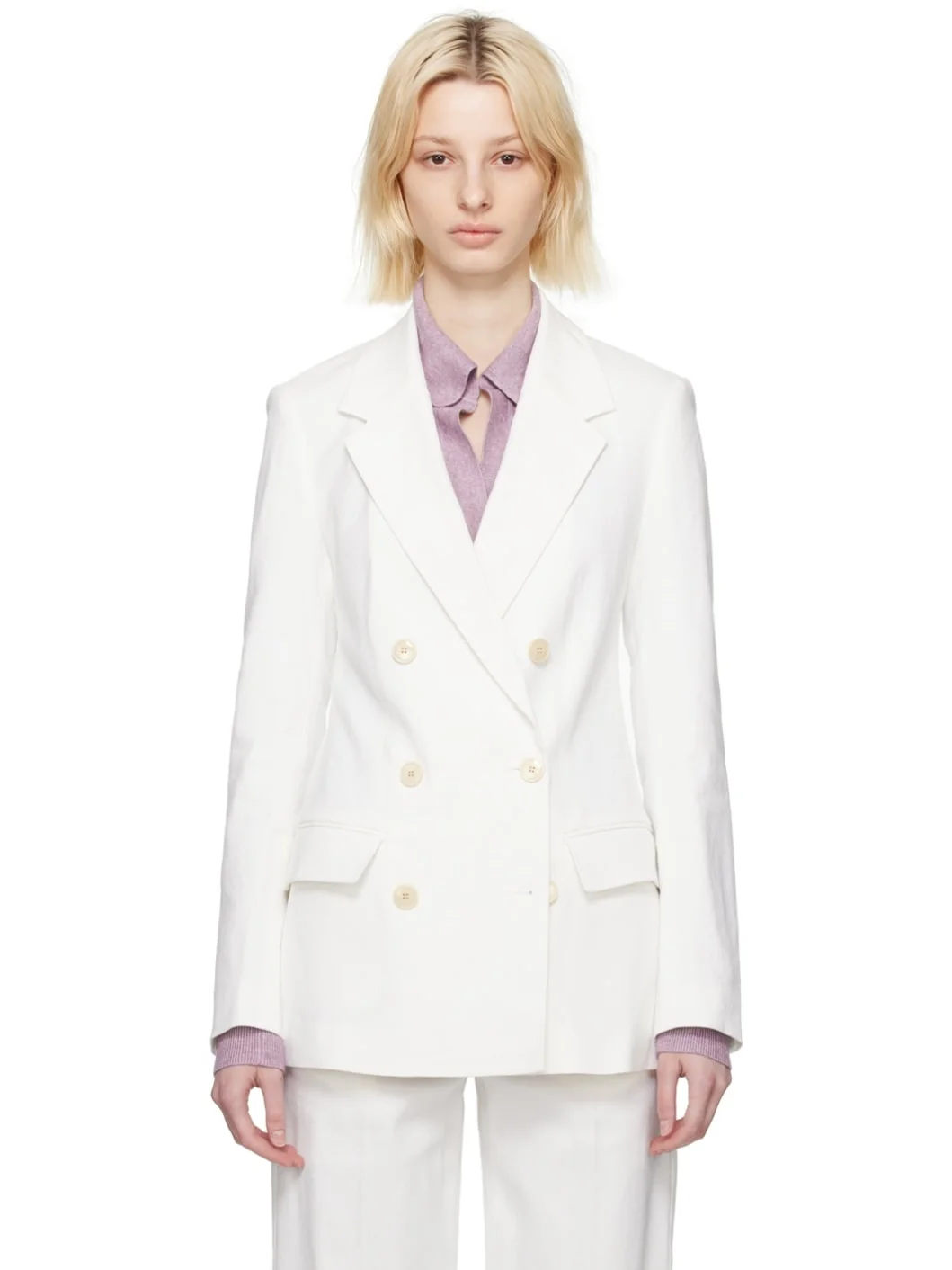 Plain-woven slubbed stretch hemp- and viscose-blend blazer. · Notched lapel · Double-breasted button closure · Flap pockets · Padded shoulders · Four-button surgeon's cuffs · Central vent at back hem · Logo-woven satin lining Supplier color: White Body: 58% hemp, 39% viscose, 3% elastane. Lining: 100% cupro. Made in Slovakia (Slovak Republic) 231600F057003