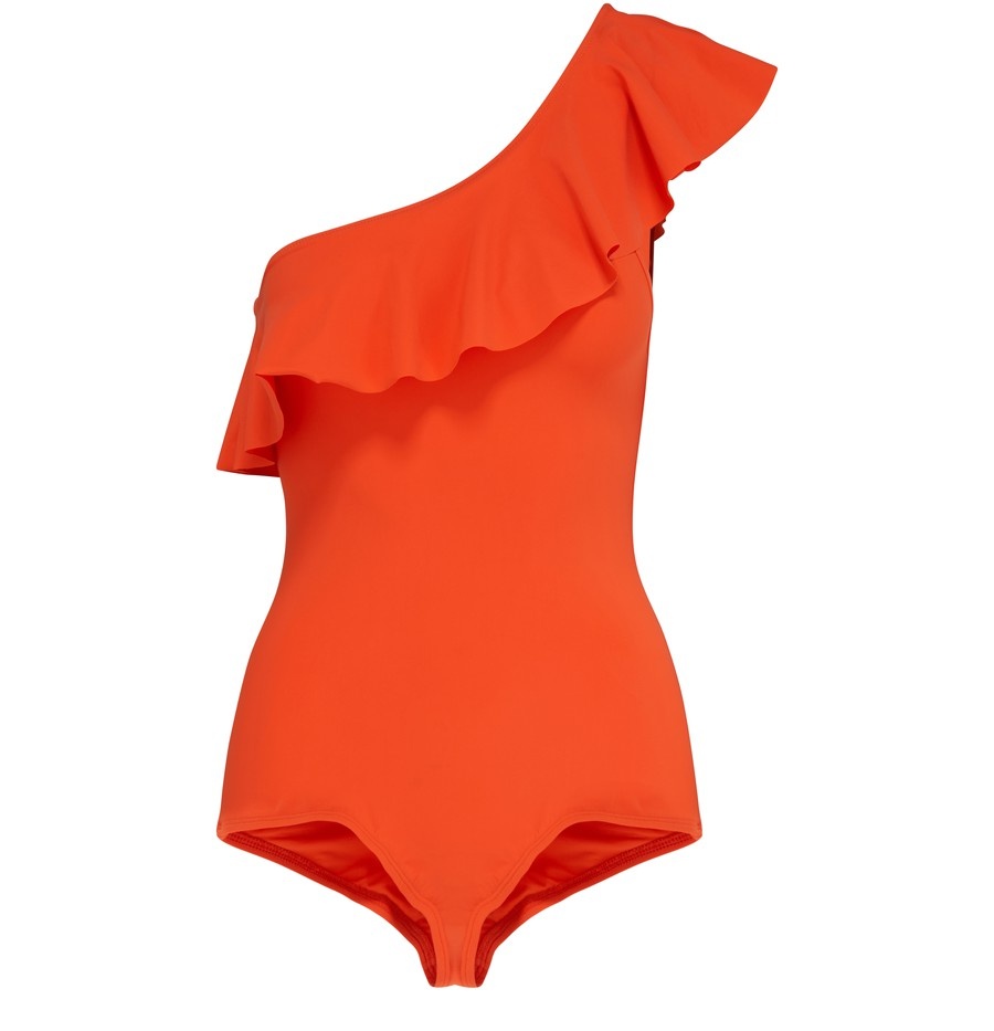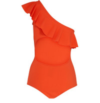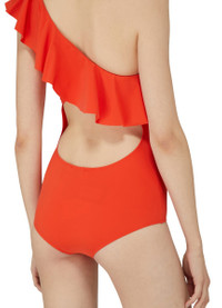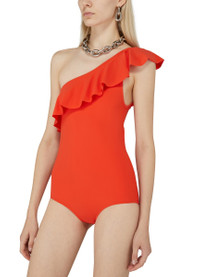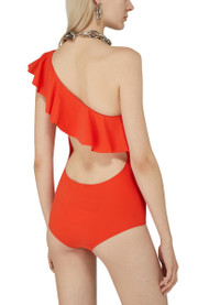 Isabel Marant Sicilya one-piece swimsuit features an asymmetric neckline and bare shoulder, with ruffle details adding a touch of femininity. The open back and low-cut design create a sultry silhouette perfect for lounging poolside or hitting the beach. DESCRIPTION - One-piece swimsuit - Asymmetric neckline - Bare shoulder - Open back - Ruffle details - Low-cut design DETAILS AND CARE MATERIAL: Main fabric: 72% Polyamide / 28% Elastan COLOR: orange COUNTRY OF MANUFACTURE: Tunisia PRODUCT CODE: IMAGFCR3ORANA1AA00 The model is 5ft 9in / 1.74m tall and wears a size FR 36.