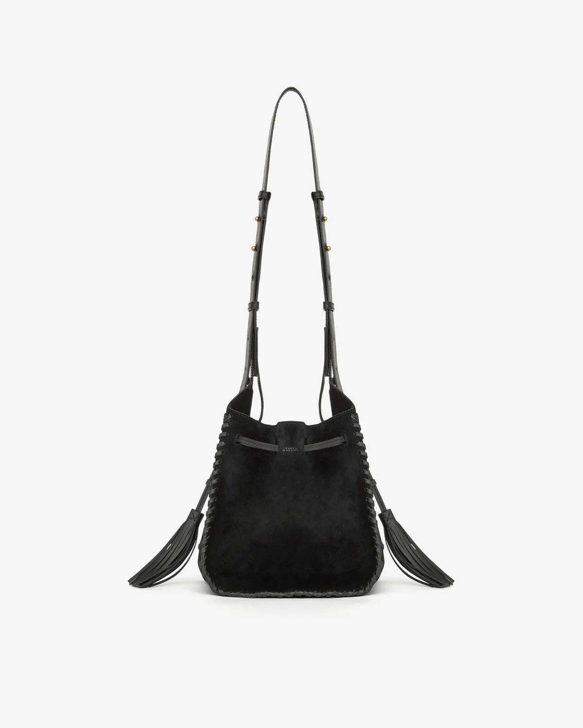 Bucket bag in braided suede calfskin leather Carried on the shoulder or crossbody style Adjustable shoulder strap with studded buttons Drawstring Fringed leather tassels on the sides Edge adorned with soft braided leather Embossed "Isabel Marant" logo Gold-finish metal details Twill lining Size: 21 x 23.5 x 14.5 cm / 8.3 x 9.3 x 5.7 in. Style: PP0306FBC1C12M01BK SILAO 100% suede calfskin leather