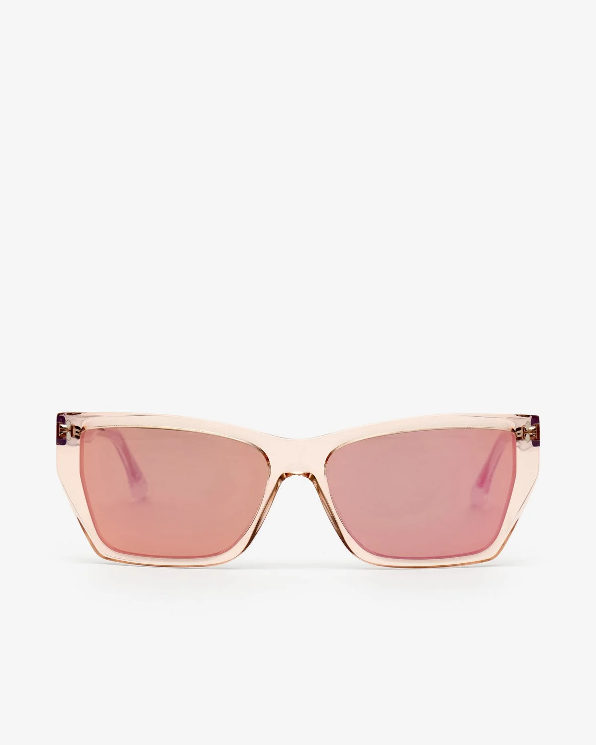 Rectangular sunglasses with a translucent pale pink frame Lens color: pink mirror with warm orange highlights Thin temples in transparent acetate with a gradient silver metal insert and a discreet engraved logo on the sides. Style: IM0197S-B2L03L TESSA Acetate 100%