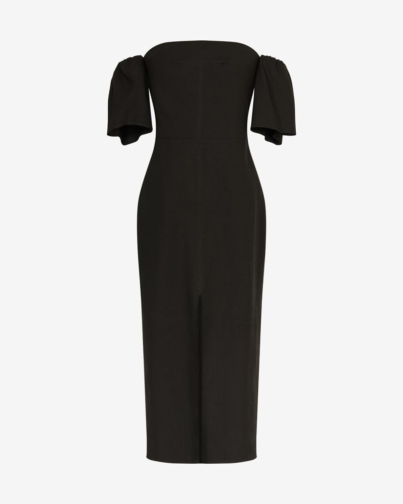 Black midi dress with short sleeves Boat neck Zip fastening Reference: RO0223FA-A3J39I STONY 58% Hemp, 39% Viscose, 3% Elastane FITTING ADVICE Fits true to size The model is wearing a size FR 38 and she is 1m77