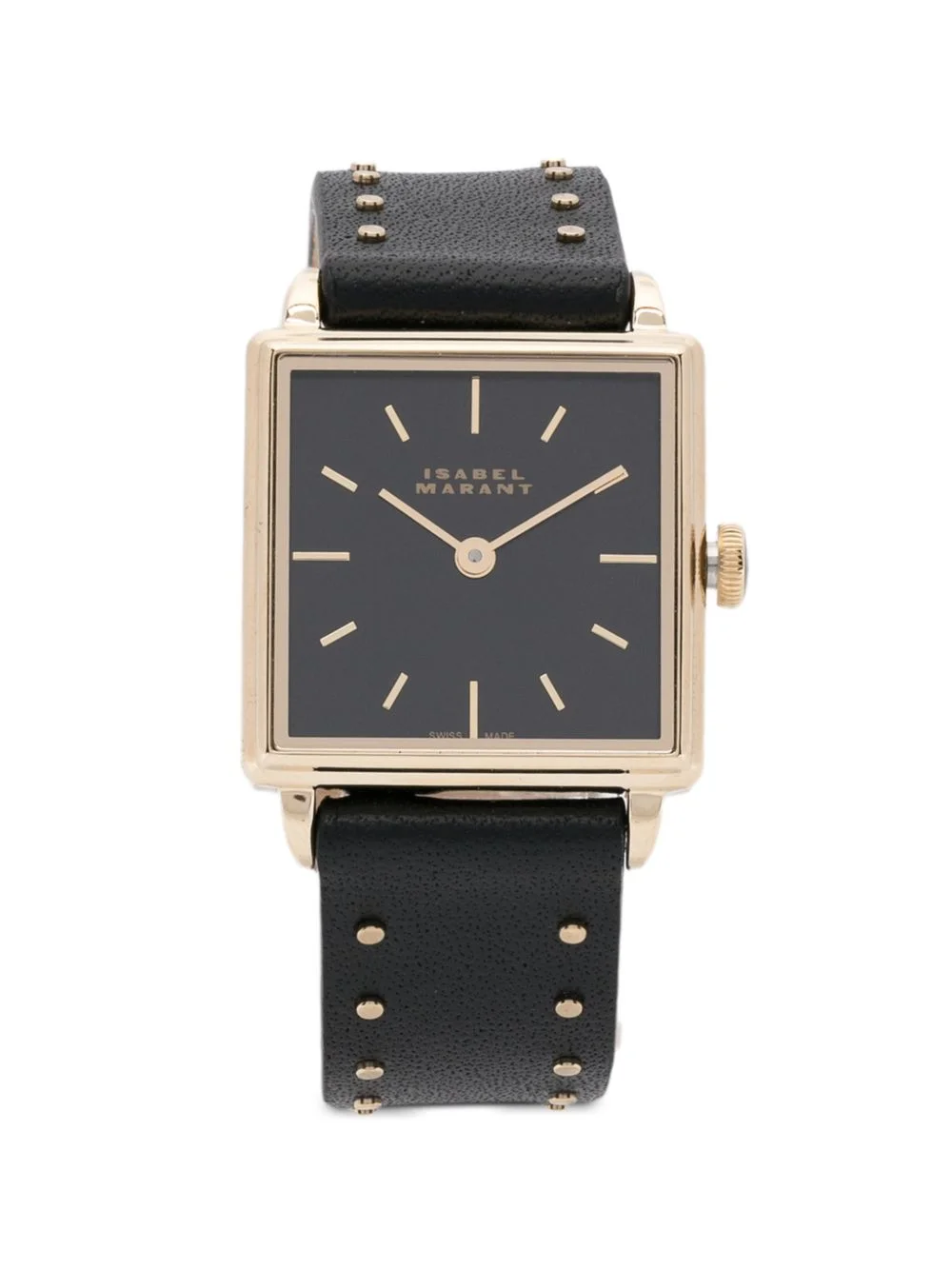 studded square 2.3mm watch Highlights - Black dial - Quartz movement - Water resistance up to 3 atm - Gold-tone case - Square case - Index markers - Studded strap - Buckle fastening - This item comes with a standard two-year warranty from the brand. Imported SIZE & FIT Model measurements Height 5 ft 9 in(1.75 m) Bust/Chest 32.67 in(83 cm) Hips 36.22 in(92 cm) Waist 24.8 in(63 cm) Measurement DIAMETER 0.9 in(2.3 cm) Thickness 0.27 in(0.7 cm) TOTAL LENGTH 7.48 in(19 cm)