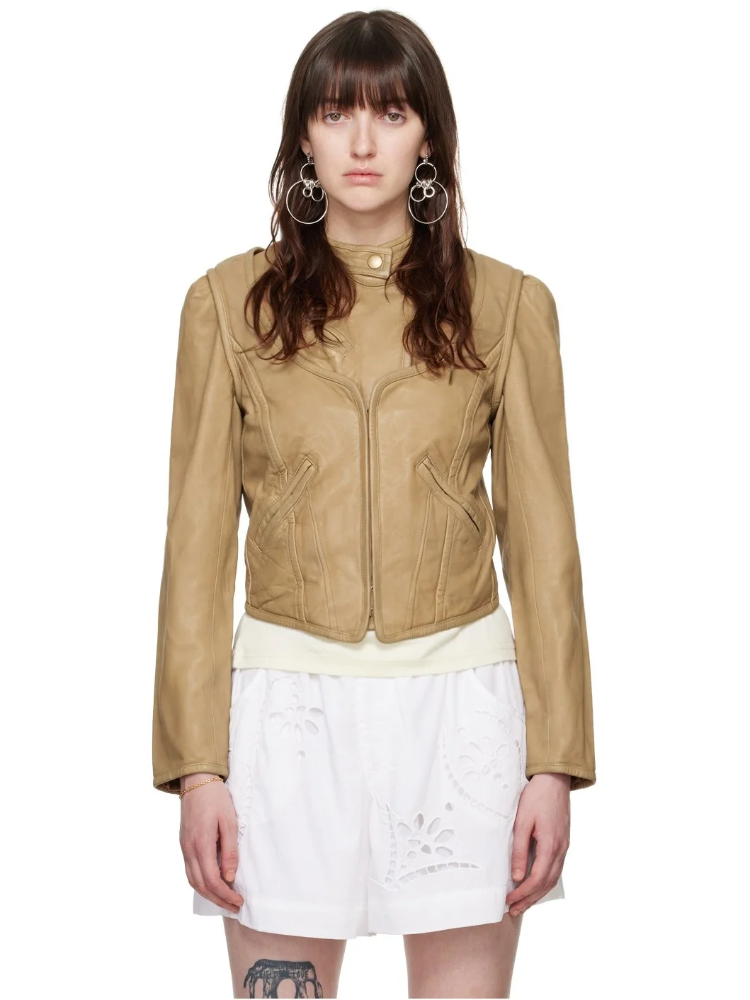 Grained lambskin jacket. · Layered construction · Press-stud band collar · Zip and hook-eye closure · Welt pockets · Gathering at shoulders · Full logo-woven cupro satin lining Supplier color: Taupe Body: 100% lambskin. Lining: 100% cupro. Made in India 241600F064002