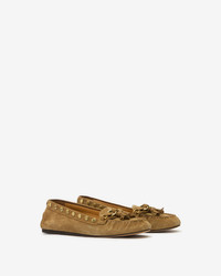 Suede calfskin leather loafers with gold-finish metal rings Round toes Straps with pompoms Soft leather insoles and outsoles Soft leather lining Style: MC0030FAD1A18S50TA FAXEL 100% suede calfskin leather Care & Sustainability the history and environmental impact of this product