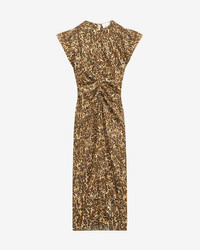 Gathered silk blend midi dress with a leopard print Round neckline Short pleated butterfly sleeves Gathered, draped style waist Done up in back with a button and a hidden zipper Asymmetrical hem Lightweight unlined fabric Flowing cut, fitted at the waist Style: RO0373FAB1J02I01BK TERENA 91% silk, 9% elastane