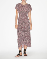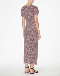 Gathered midi dress in printed jersey Round neckline Short frilly sleeves with pleats Gathered, draped style waist Done up in back with a button and a hidden zipper Asymmetrical hem Lightweight unlined fabric Flowing cut, fitted at the waist Style: RO0373FCC1K03IPUEC TERENA 92% viscose, 8% elastane