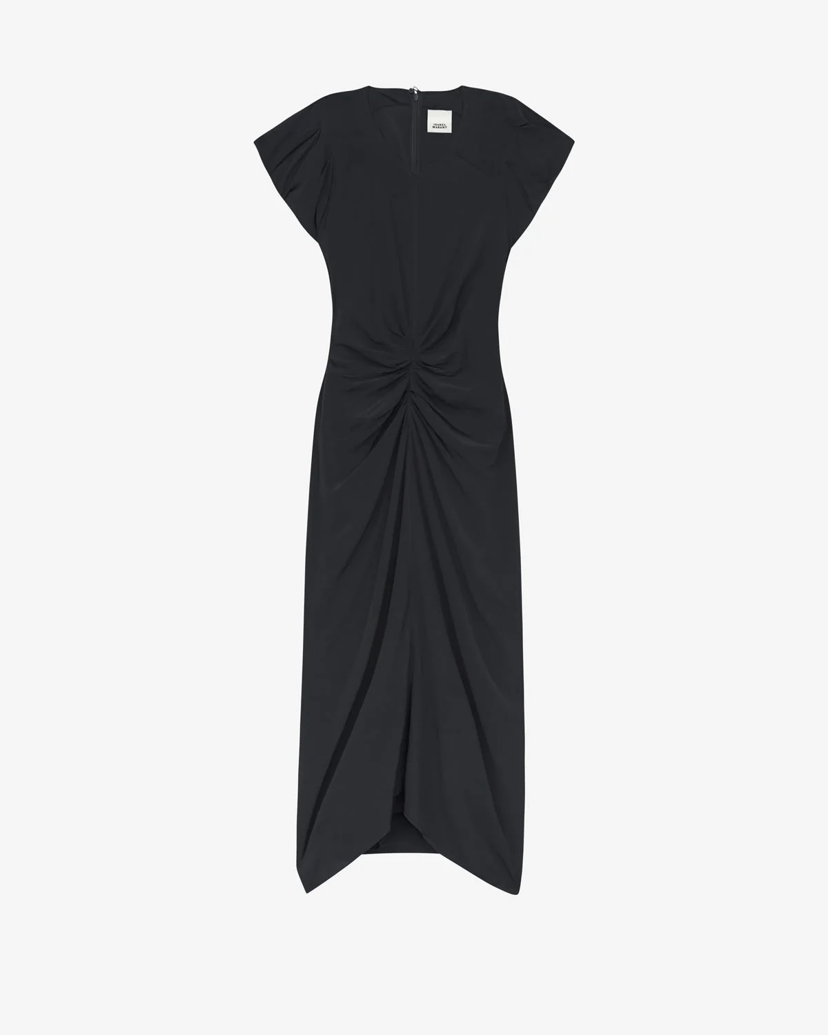 Gathered plain-colored midi dress Round neckline Short frilly sleeves with pleats Gathered, draped style waist Done up in back with a button and a hidden zipper Asymmetrical hem Lightweight unlined fabric Flowing cut, fitted at the waist Style: RO0373FDB1J12I01BK TERENA 100% viscose