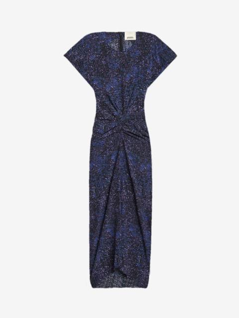 Gathered printed silk blend mosaic pattern midi dress Round neckline Short pleated butterfly sleeves Gathered, draped style waist Done up in back with a button and a hidden zipper Asymmetrical hem Lightweight unlined fabric Flowing cut, fitted at the waist Style: RO0373FBC3J08I10OE TERENA 91% silk, 9% elastane