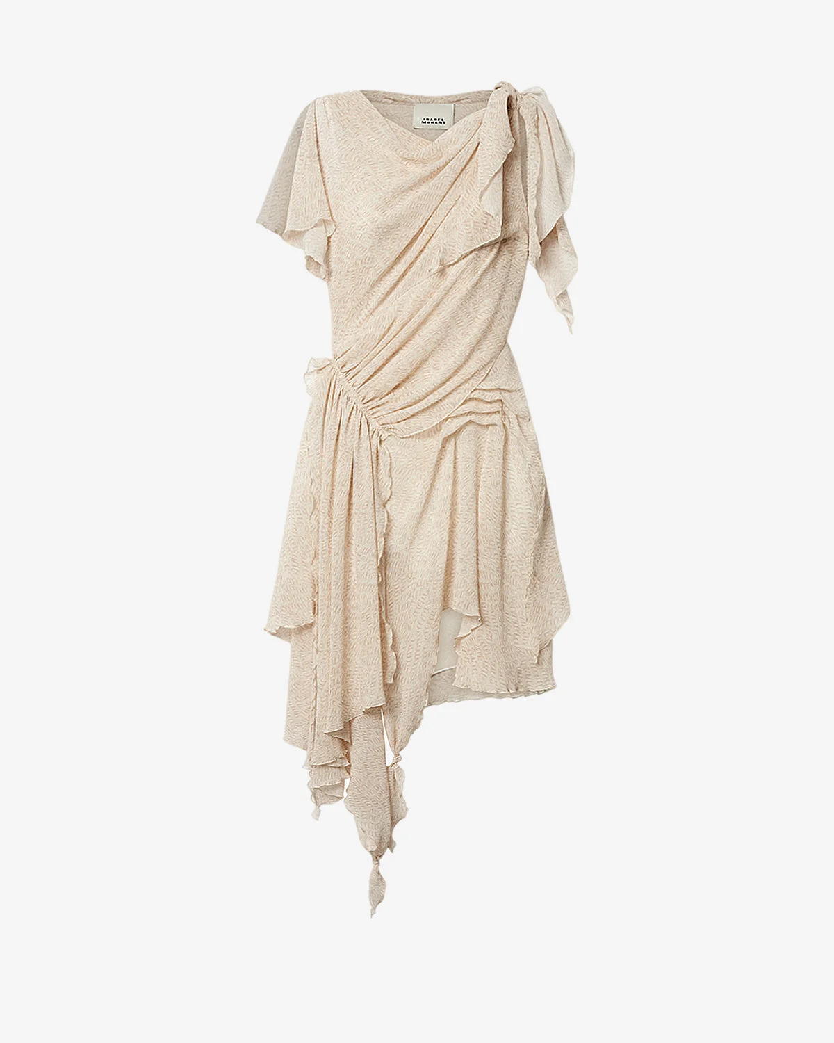 Printed ecru silk georgette dress Short and flared Boat neck Sleeveless with gathered and tied ruffled shoulders Pleated and gathered front, tie-up tails Side slit Done up on the side with a hidden zipper Style: RO1078FAD2J05I23EC 100% silk Care & Sustainability Dry clean only For more details, see the instructions on the composition label the history and environmental impact of this product