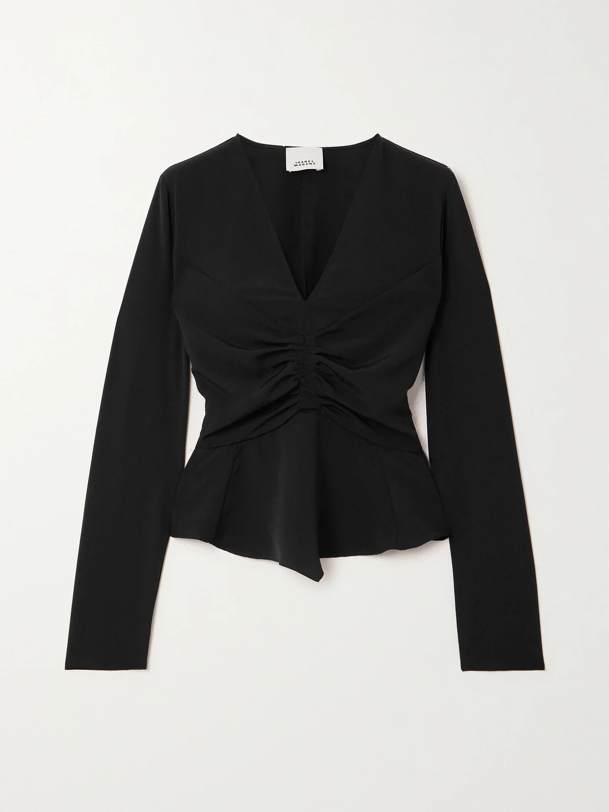 If you live in pants then you'll need a few tops like Isabel Marant's 'Tundra' blouse on hand for evening events. It's made from black crepe de chine and gathered through the bodice to draw the eye to your waist. The asymmetric hem looks best left draped over high-rise jeans or tailoring.
