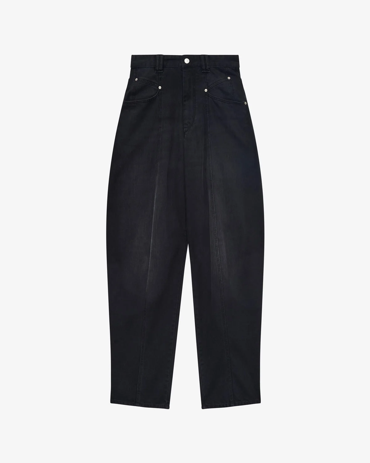 Loose fit denim jeans Fitted waistband with double loops Engraved metal button tab with a zipper Side pockets and patch pockets in back Leather label in back with an "Isabel Marant" logo Silver-finish metal rivets High waist Style: PA0045FBB1H06I01BK VETAN 100% cotton