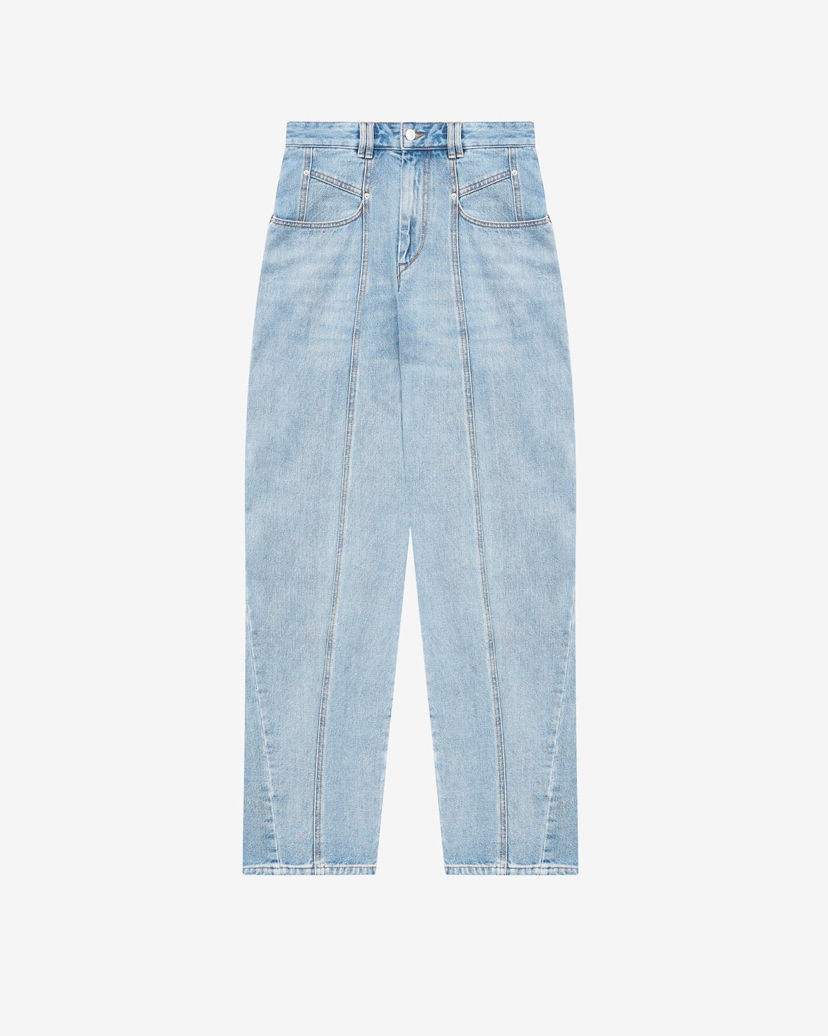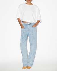 Loose fit denim jeans Fitted waistband with double loops Engraved metal button tab with a zipper Side pockets and patch pockets in back Leather label in back with an "Isabel Marant" logo Silver-finish metal rivets High waist 100% cotton