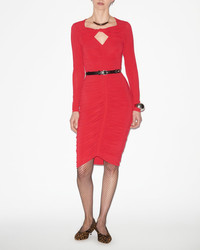 Midi dress in gathered jersey V-neckline with a twisted yoke Gathered front Long sleeves Done up in back with a button and a hidden zipper Fitted cut Style: RO0582FA-B3K01I VOLGANE 92% viscose, 8% elastane