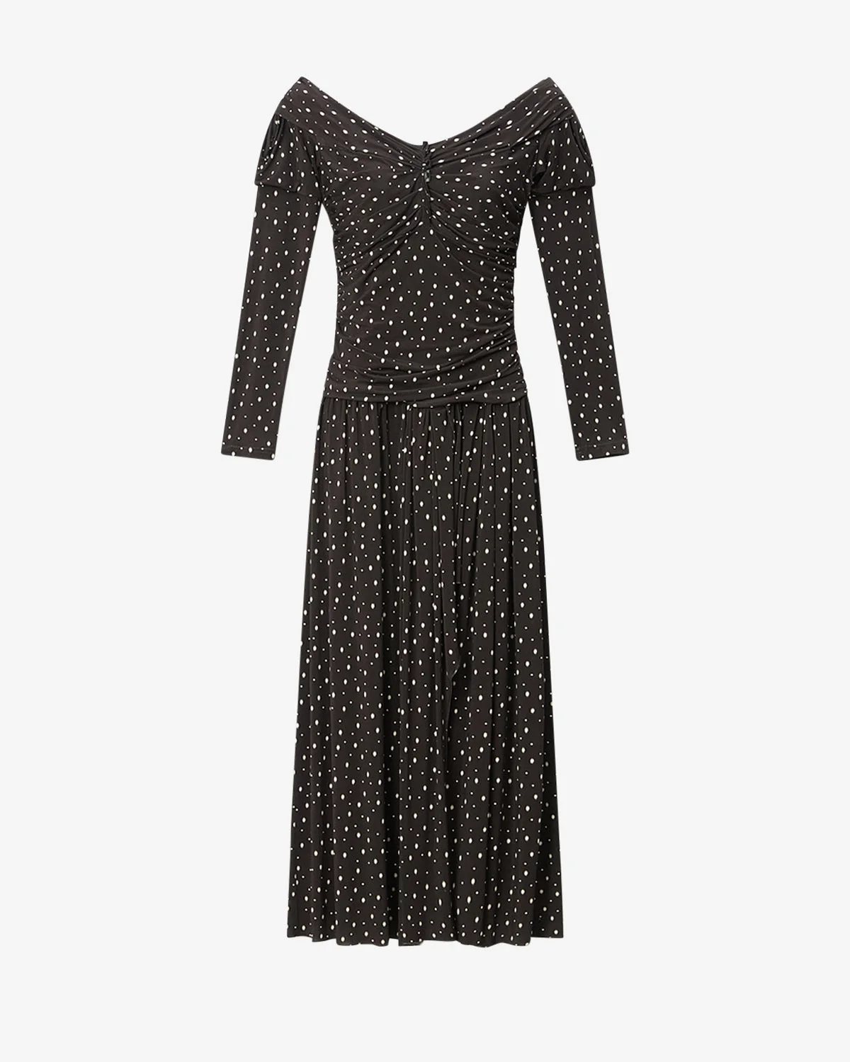 Long off-the-shoulder polka dot print jersey dress Straight low-cut neckline with draped bare shoulders Long fitted sleeves with puffy tops Gathers and hidden zipper on the side Skirt with tail and asymmetrical hem Fitted top and flared base Style: RO1042FAD1K03IBKEC GIOVANA 94% viscose, 6% elastane Care & Sustainability Dry clean only For more details, see the instructions on the composition label the history and environmental impact of this product