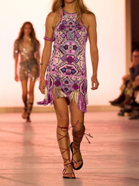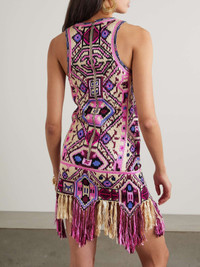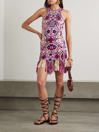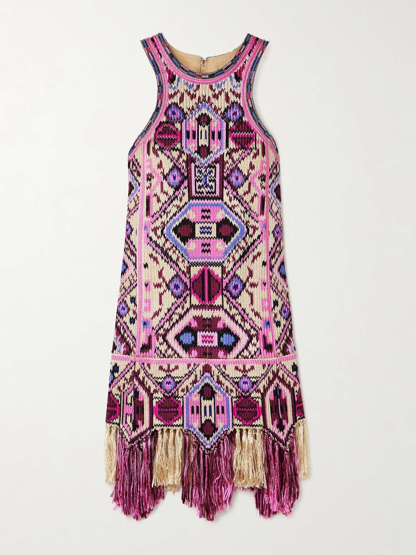 EDITORS'NOTES Isabel Marant's Spring '25 collection comes to life through intricate craftsmanship – seen on the runway, this 'Yasmine' dress is inspired by traditional tapestries. It's made from silk that's almost completely covered with cotton embroidery in a geometric pattern and has a scalloped hem edged with swishy fringing. Wear yours with gladiator sandals. SIZE & FIT Model measurements: - Fits true to size, take your normal size - Designed for a close fit - Mid-weight knit with fringed trim - Model is 177cm/ 5'10" and is wearing a FR 36 - Bust: 81cm/ 32" - Waist: 66cm/ 26" - Hip: 94cm/ 37" DETAILS & CARE - Light-pink silk, multicolored cotton - Zip fastening along back - 100% silk; embroidery: 100% cotton; trim: 100% viscose - Dry clean