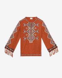 Matka silk blouse embroidered with beads, sequins, and threads Round neckline with slit Hook fasteners in front Long sleeves with fringes Relaxed fit Style: HT0668FAC2J09I11BO ZELDA 100% silk