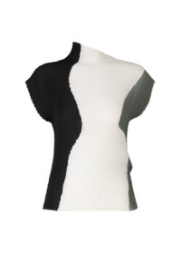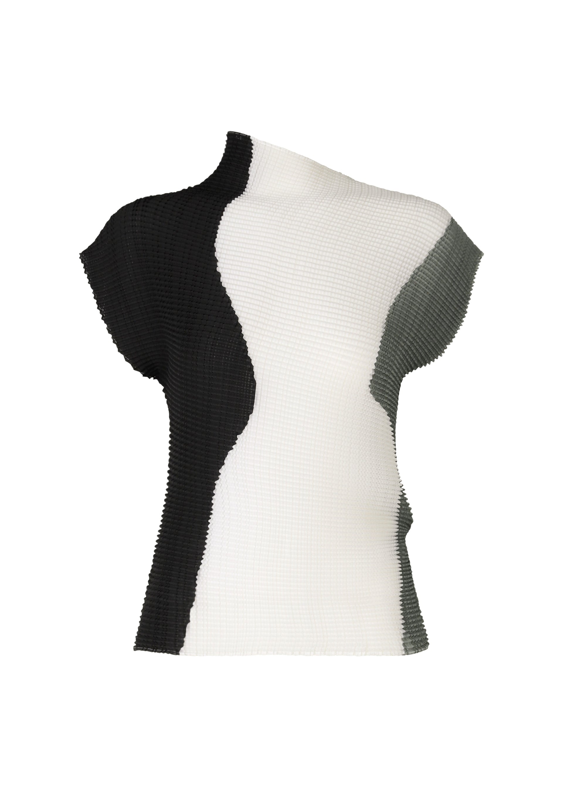 This top uses dye transfer during pleating to create an abstract print pattern. The garment is constructed by joining the bodice with different lines and colors on the front and back, then applying a pleating treatment so that the two-color fabric appears to have three colors through dye transfer, creating a playful design. The pattern is slightly distorted to create draping when worn, emphasizing the emerging pattern. The size of this product varies slightly from item to item. Please note this in advance. Product Information Material: 100% polyester Made in the Philippines