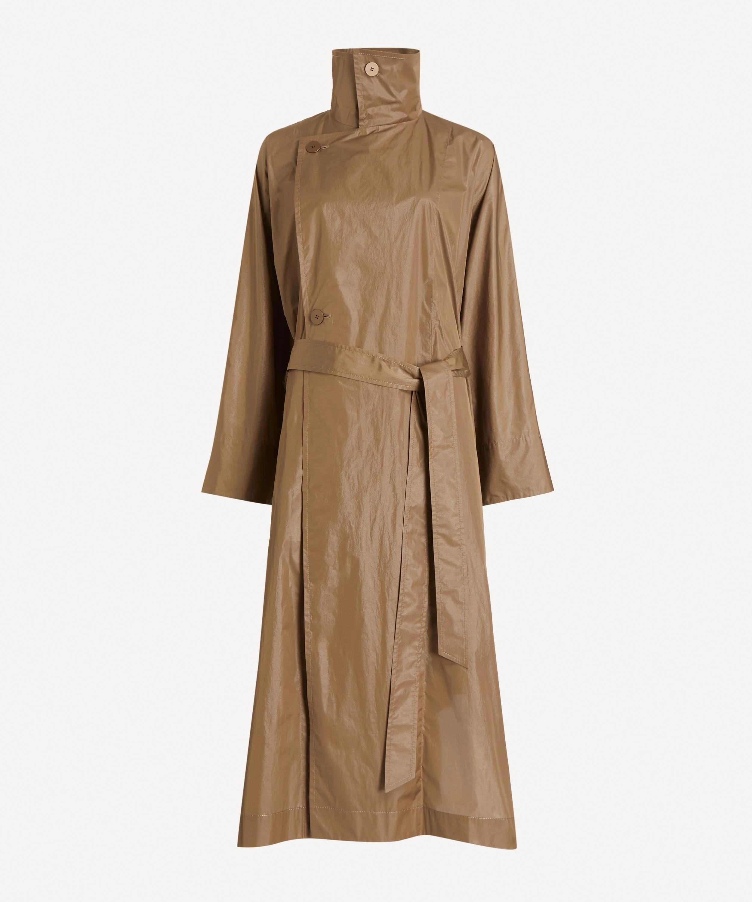 DETAILS Trench coat AERIAL STEEL fabrication Oversized fit Double-breasted High stand collar Off-centre button placket Matching belt Side pockets Side slits SIZE & FIT Model is 177cm/5'9.5"; Chest: 78cm; Waist: 59.5cm; Hip: 86.5cm and wears a size 2 COMPOSITION & CARE 100% Polyester Hand wash cold. Do not bleach. Do not tumble dry. Line dry in shade. Cool iron. Dry clean, short cycle