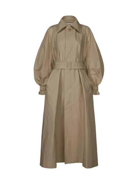 This long coat imparts a deliberate sense of incongruity with its voluminous silhouette, created by incorporating puffy sections in unexpected places. Inspired by the theme of “organic and inorganic,” this coat was designed to intentionally evoke a sense of incongruity in its materials, achieved by combining the contrasting elements of natural and synthetic fibers. This use of seemingly conflicting materials yields a firm texture along with an elegant sheen and softness, as well as an uneven surface on the fabric. Enjoy its dynamic silhouette and lightweight feel. Product Information Material: 78% Polyester, 22% Miscellaneous Fiber (Washi) Made In Japan Neckline / Collar:Stand collar Front opening:Double-breasted button Pocket (position):Both sides Vent (location):Center vent accessories:Belt made from the same fabric