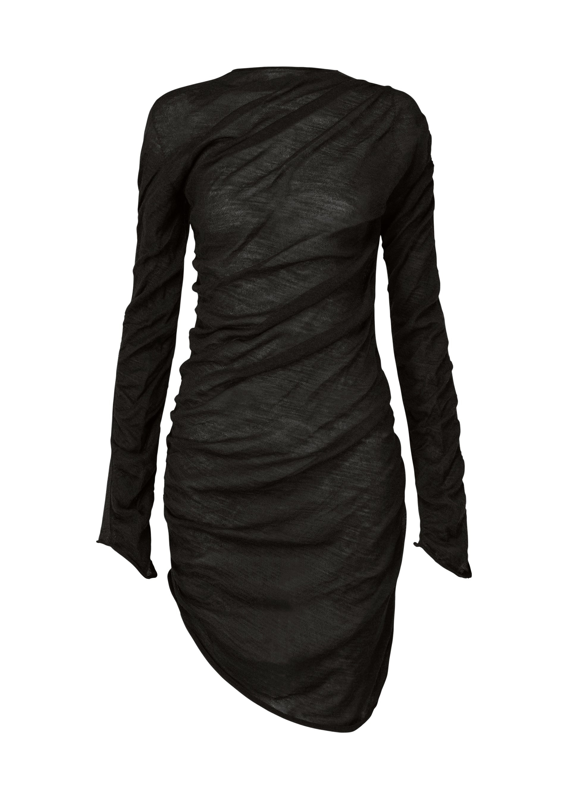 This knit tunic, made by twirling threads to create natural twisting, evokes the delicate, ambiguous feel of a material that seems to adhere the body. It is made using diagonal high-twist wool yarn and the front is knitted with twice the volume of yarn, which creates a silhouette that moderately separates from the body. The back is knitted in straight lines by combining high-twist threads twisted in opposite directions. Despite its very simple construction, the clever use of threads and knitting for the front and back sides yields a design with natural twisting.