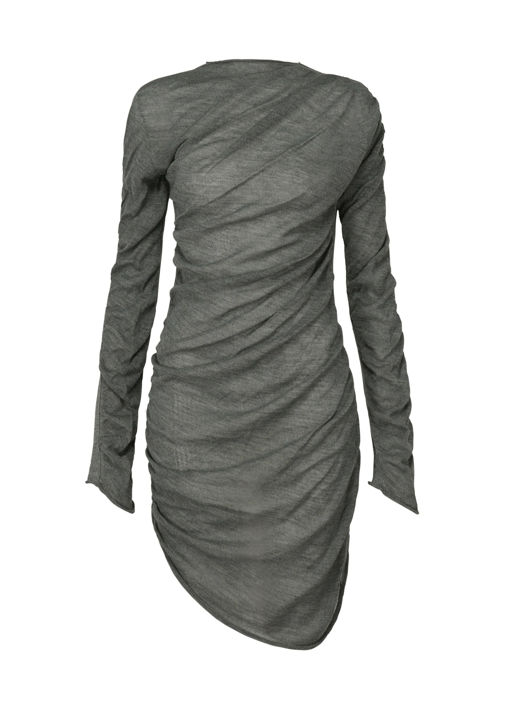 This knit tunic, made by twirling threads to create natural twisting, evokes the delicate, ambiguous feel of a material that seems to adhere the body. It is made using diagonal high-twist wool yarn and the front is knitted with twice the volume of yarn, which creates a silhouette that moderately separates from the body. The back is knitted in straight lines by combining high-twist threads twisted in opposite directions. Despite its very simple construction, the clever use of threads and knitting for the front and back sides yields a design with natural twisting.