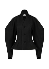 This collarless jacket is characterized by a well-defined sleeve form and a finish that expands and reimagines the perception of the body. Featuring a distinctive curved waist design, it accentuates the body contours beautifully. It is triple-woven using cotton warp threads and high-twist weft threads of polyester/polyurethane. The uneven textured surface has a robust density and moderate thickness, and despite being a cloth garment, offers just the right amount of stretch to hug the body comfortably. Product Information Material: 55% Polyester, 40% Cotton, 5% Polyurethane Made In Japan Neckline / Collar:No collar / V-neck Front opening:button
