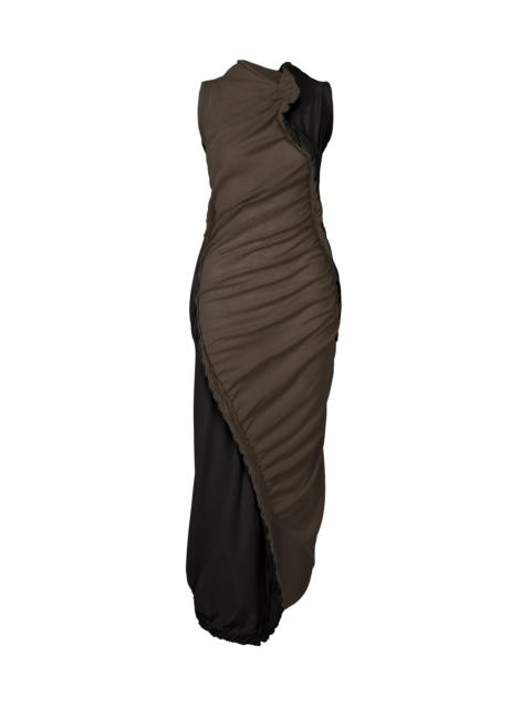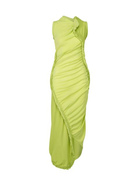 This non-sewn knit dress uses a double-knitting technique for the organic form inspired by the vitality of plants. It is knit on the front and back by alternating two types of thread made from S-twist cotton and recycled polyester. Due to the characteristics of the S-twist thread, the knit fabric twists in a spiral, and the double-knitted areas form wrinkles, creating a design that resembles plant vines stretching toward the sky. Product Information Material: 62% cotton, 38% polyester Country of origin: Japan