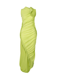 This non-sewn knit dress uses a double-knitting technique for the organic form inspired by the vitality of plants. It is knit on the front and back by alternating two types of thread made from S-twist cotton and recycled polyester. Due to the characteristics of the S-twist thread, the knit fabric twists in a spiral, and the double-knitted areas form wrinkles, creating a design that resembles plant vines stretching toward the sky. Product Information Material: 62% cotton, 38% polyester Country of origin: Japan