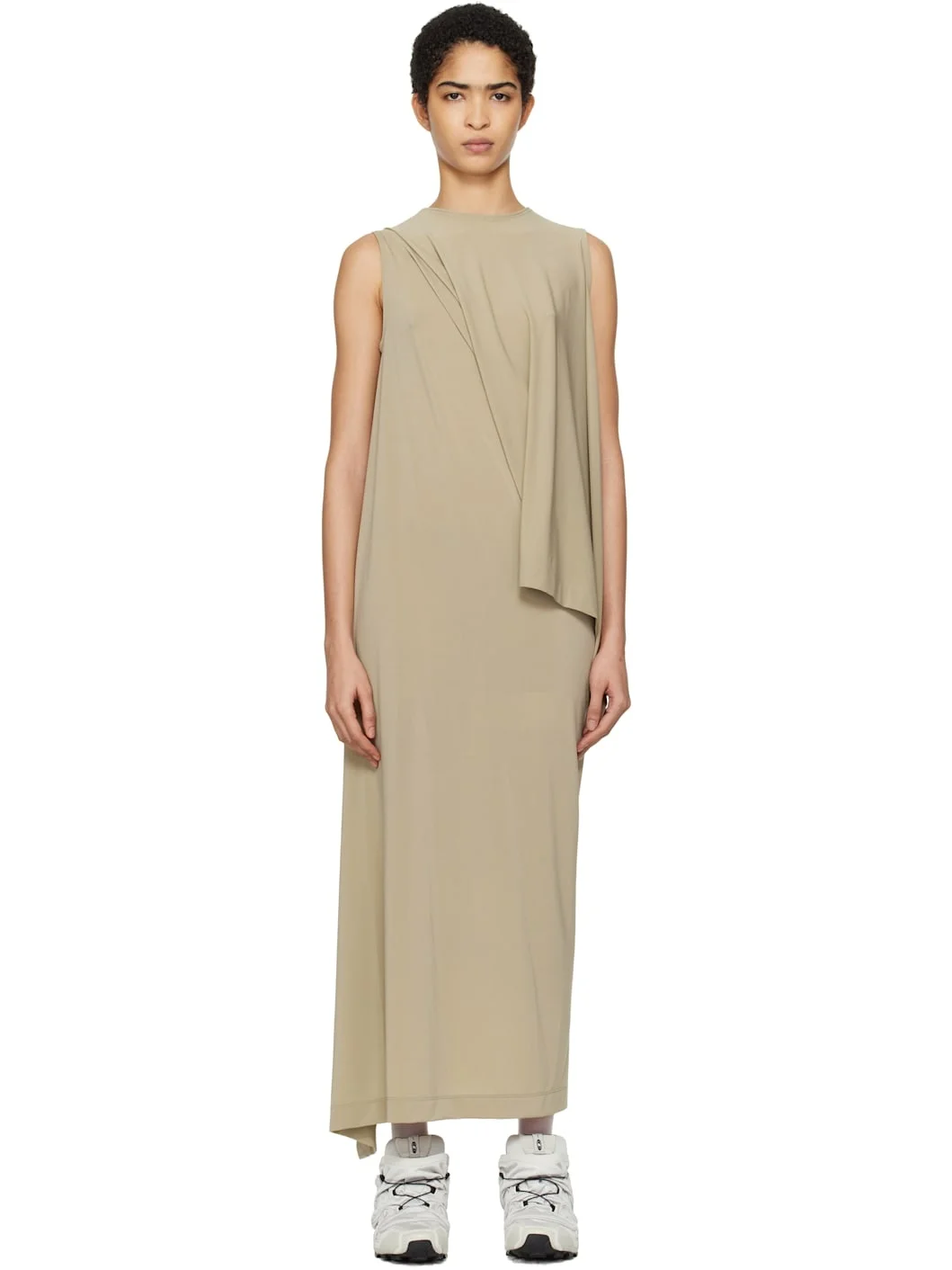 Stretch triacetate- and polyester-blend jersey maxi dress. · Asymmetric construction · Crewneck · Extended trim at side seam Supplier color: Kudzu khaki 72% triacetate, 18% polyester, 10% polyurethane. Made in Japan 251809F055005