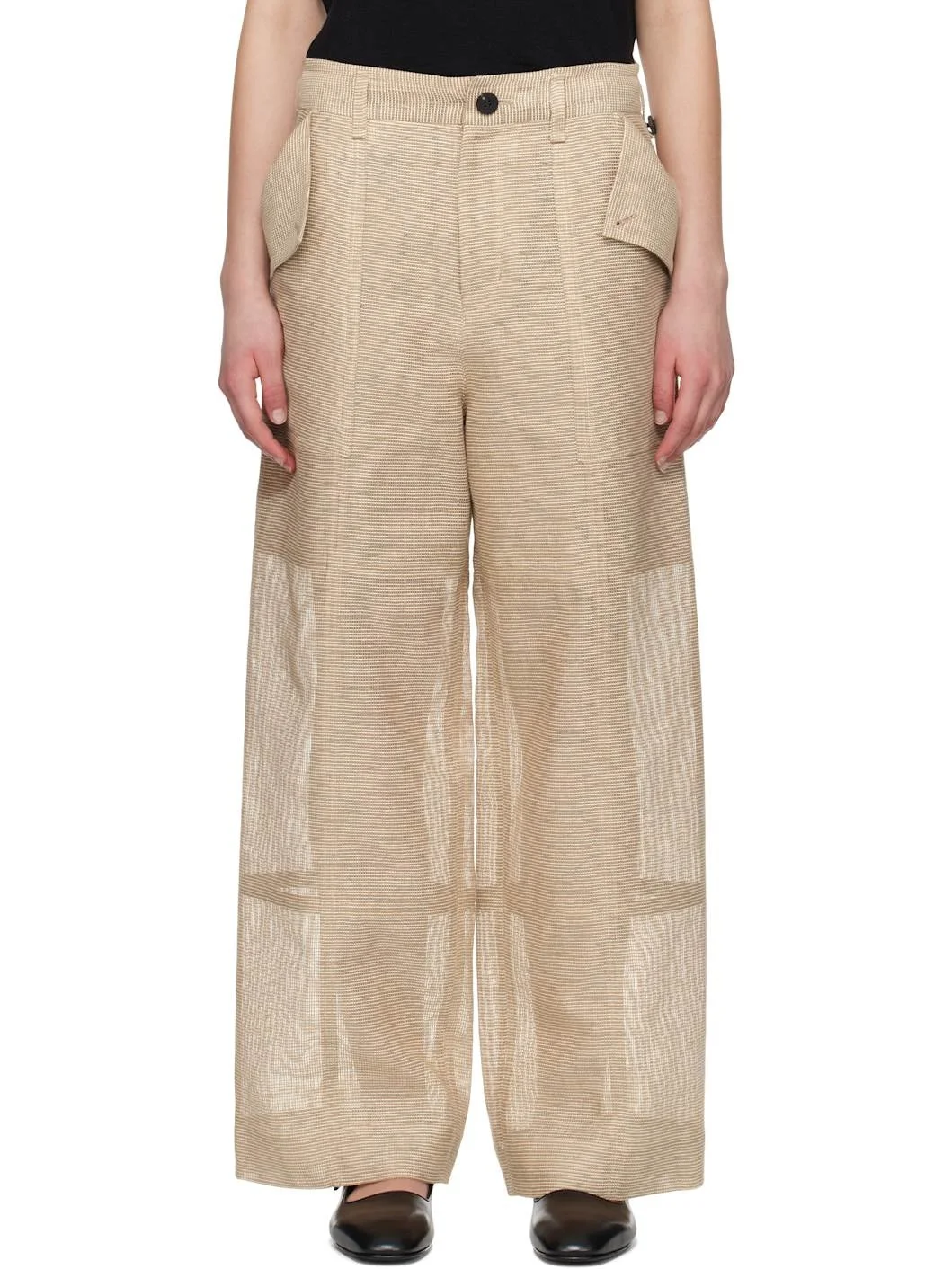 Semi-sheer paper- and ramie-blend mesh trousers. · Straight-leg · Belt loops · Four-pocket styling · Zip fly · Button fastening at front pockets · Webbing seams at interior Supplier color: Cedar brown Body: 45% paper, 38% ramie, 17% cotton. Trim: 100% cotton. Lining: 45% paper, 38% ramie, 17% cotton. Made in Japan 252809F087000