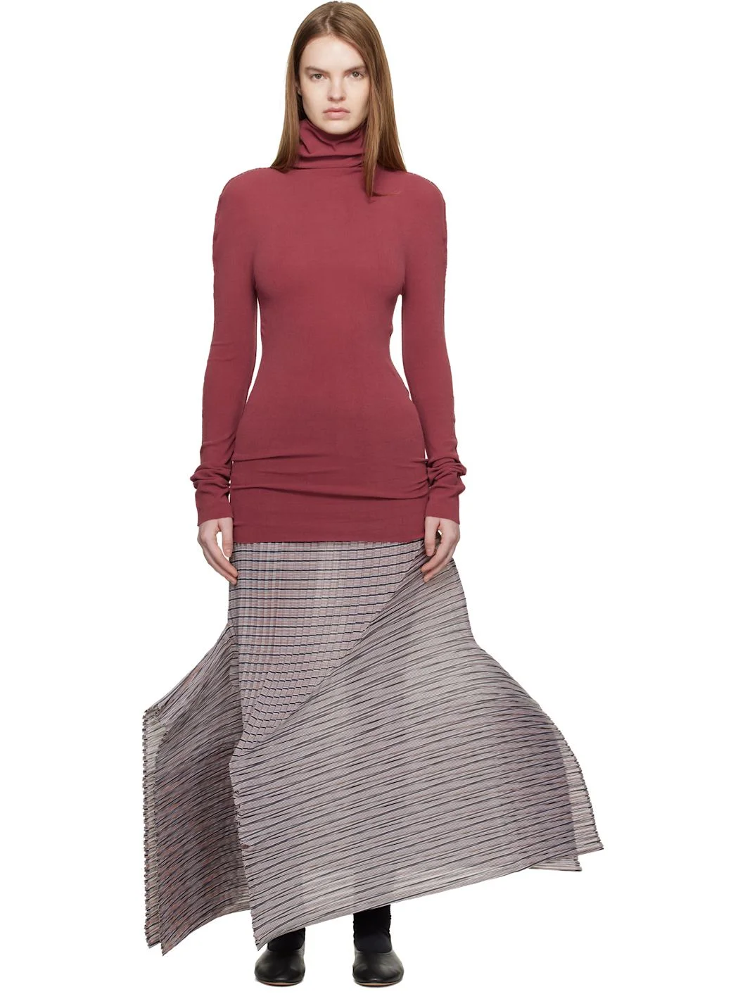 Garment-pleated and semi-sheer plain-woven midi skirt. · Stripes throughout · Elasticized waistband · Sculptural asymmetric hem Supplier color: Black hued 100% polyester. Made in Japan 261809F092002