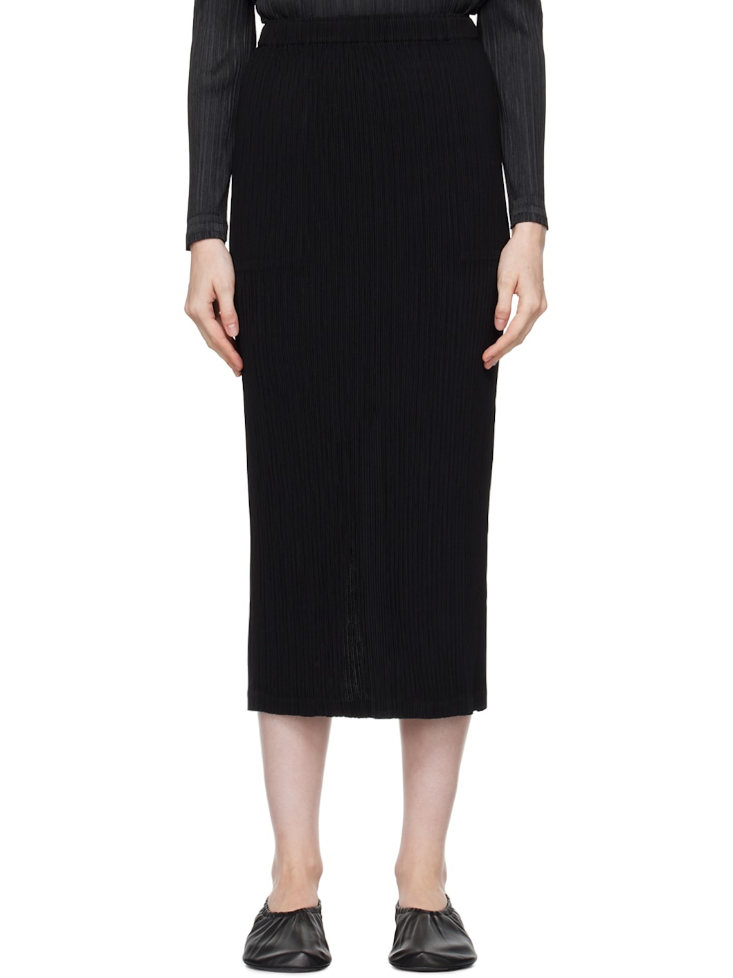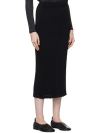 Garment-pleated recycled polyester tricot skirt. · Elasticized waistband · Two-pocket styling · Central vent at back hem Supplier color: Black