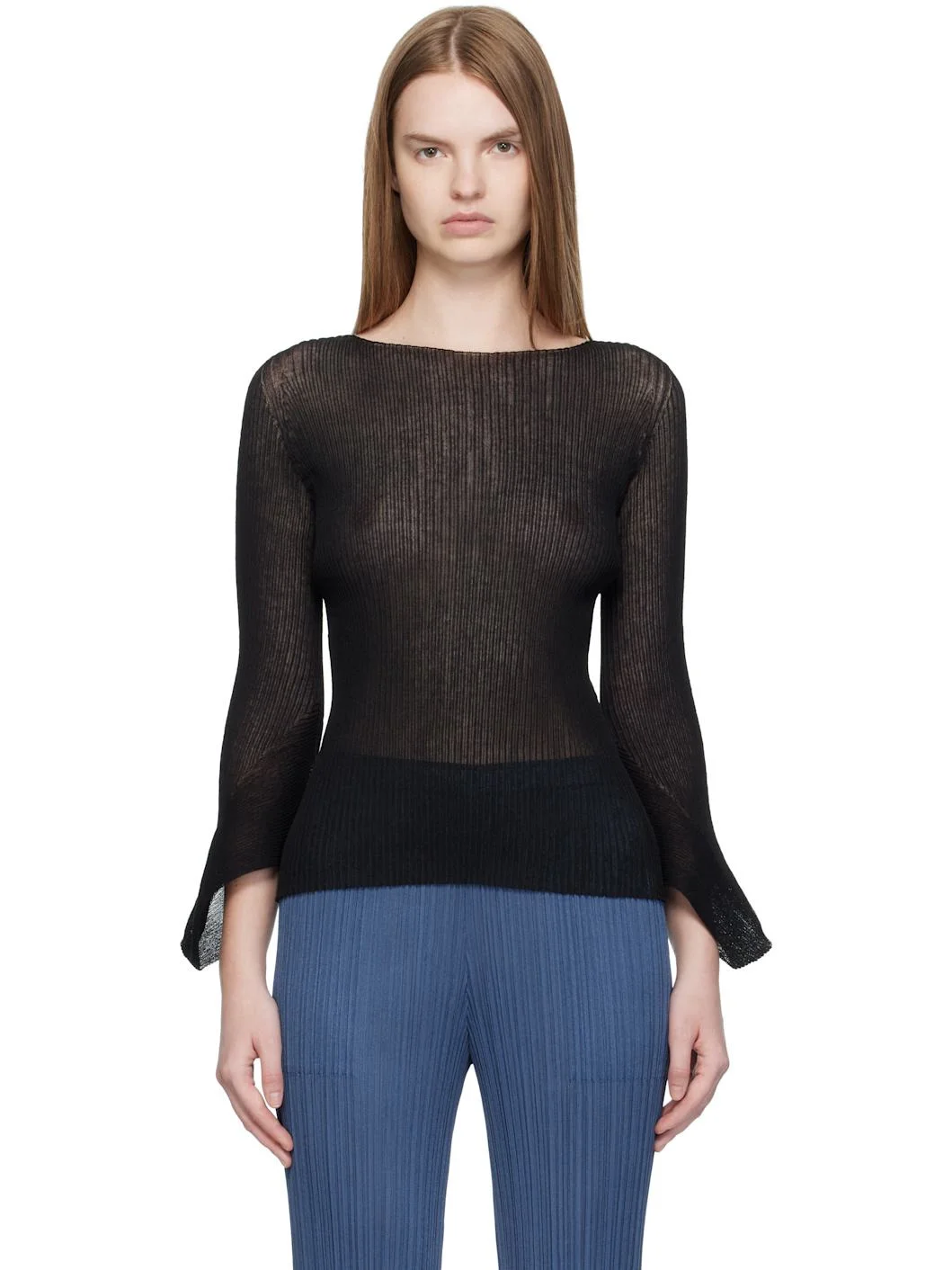 Semi-sheer rib-knit sweater. · Boatneck · Modified bell sleeves Supplier color: Black 77% polyester, 23% ramie. Made in Japan 252809F096001
