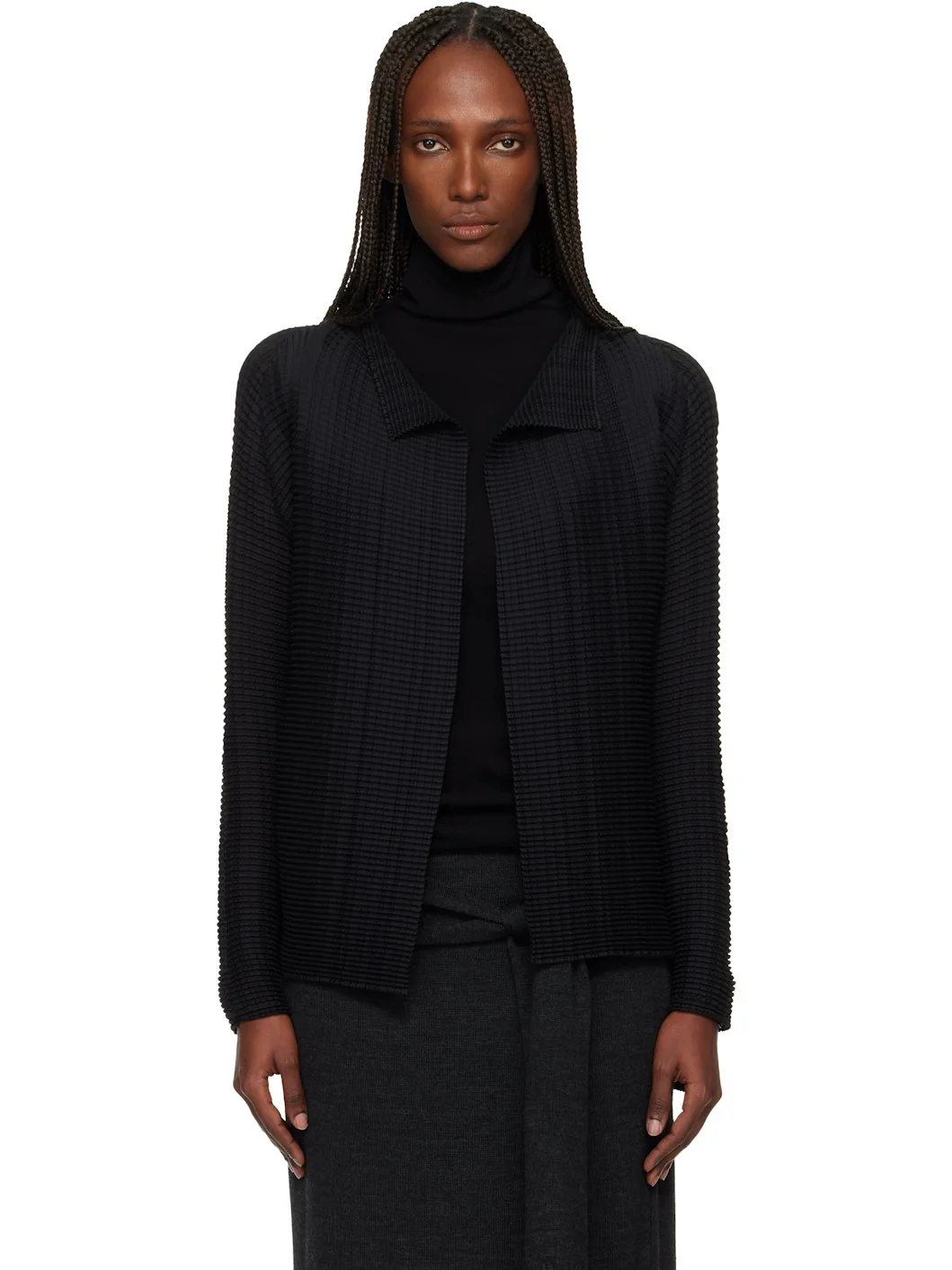 Garment-pleated recycled polyester chiffon cardigan. · Semi-sheer · Stand collar · Open front Supplier color: Black 100% polyester. Made in Japan 261809F095002
