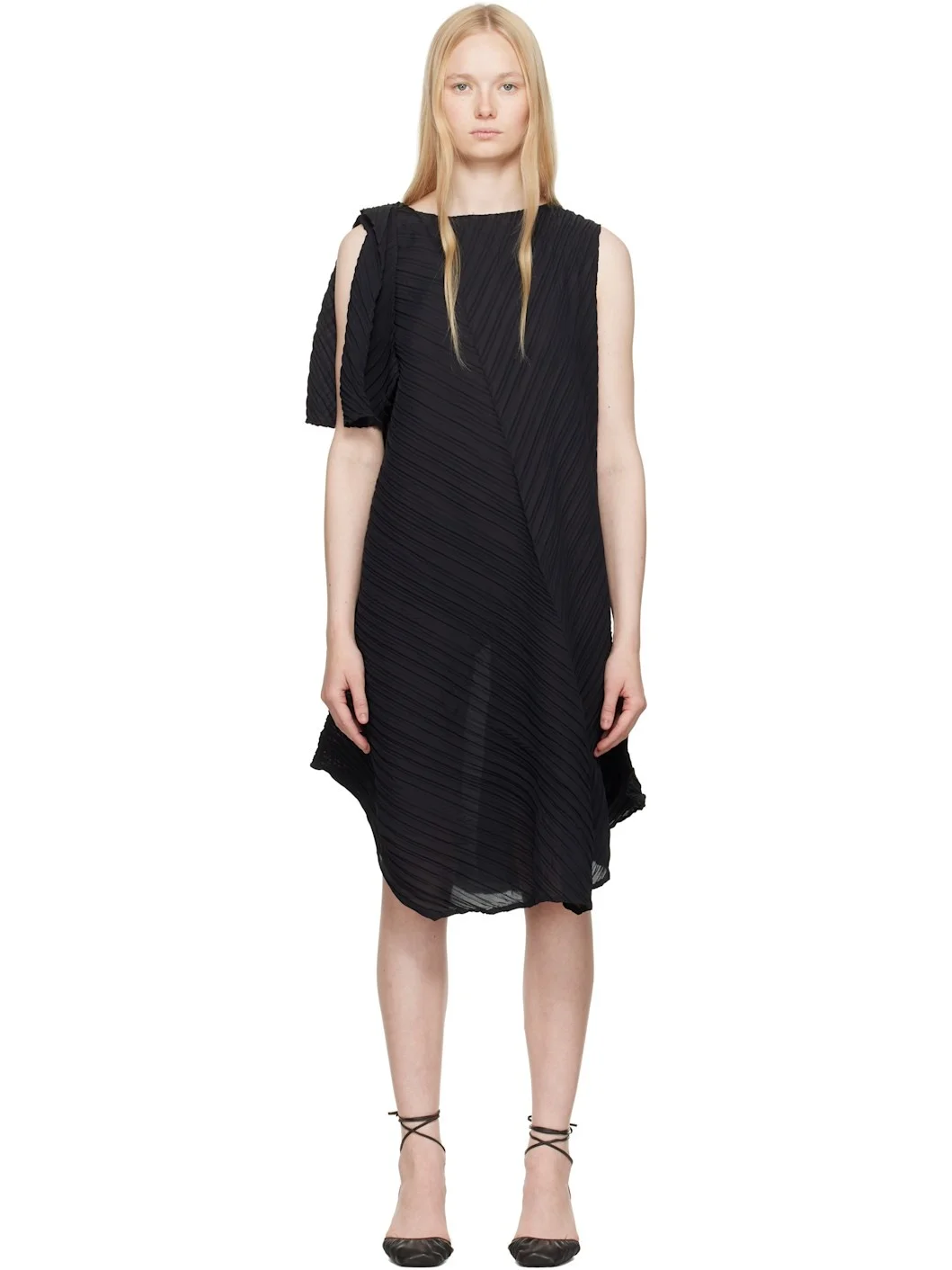Semi-sheer garment-pleated plain-woven polyester minidress. · Asymmetrical construction · Boatneck · Button fastening and extended trim at shoulder Supplier color: Black 100% polyester. Made in Japan 252809F052003